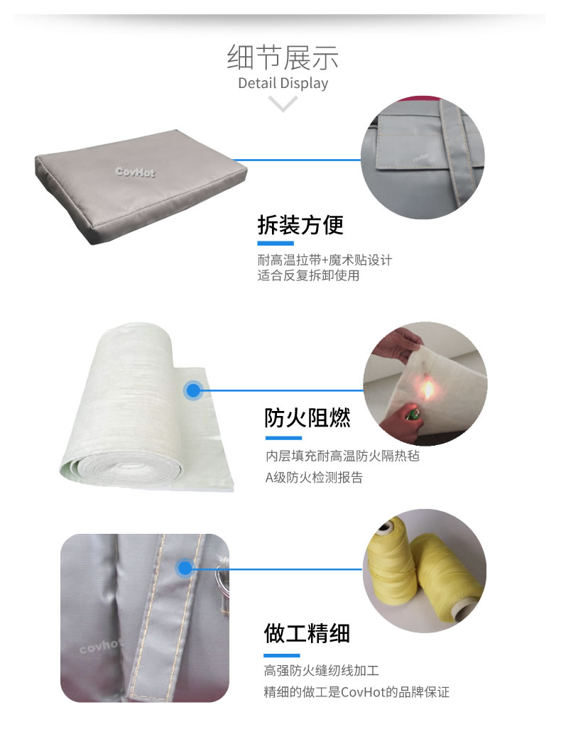 可拆式保溫套保溫效果好,拆裝方便,易于日常維護保養(yǎng),能反復(fù)使用,對環(huán)境無污染,與人體接觸后不刺激皮膚。根據(jù)現(xiàn)場的物料產(chǎn)生火災(zāi)的可能性、火災(zāi)的預(yù)期溫度、救火需要的時間等綜合考慮,設(shè)計適應(yīng)不同的溫度、耐火時間,從而達(dá)到經(jīng)濟、合適的防火效果。