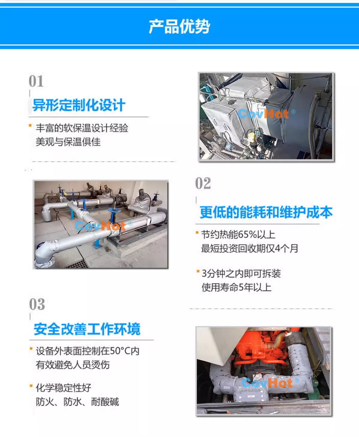 具有易操作,節省維護時間和保溫成本。解決了如法蘭等經常拆卸部位難以重新保溫的問題,減少了能源浪費。